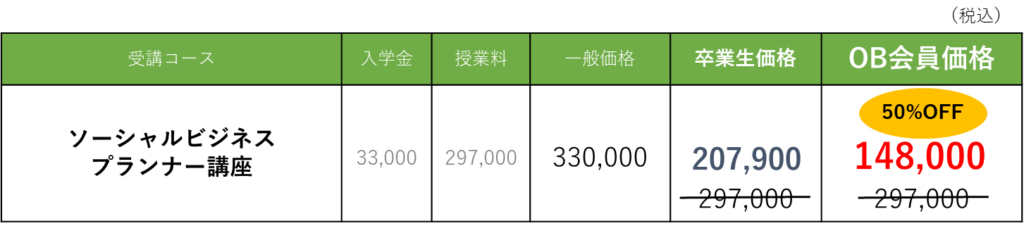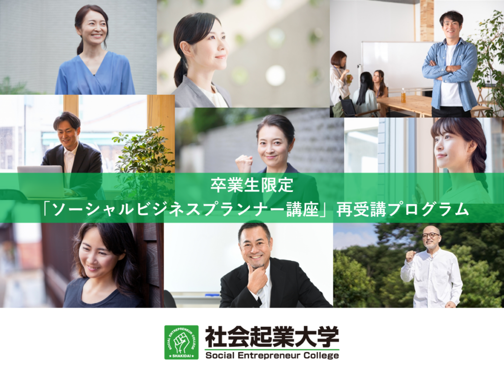 今回、社会起業大学の卒業生の皆様には、このソーシャルビジネスプランナー講座を、最大50%OFFの特別価格でご受講いただける再受講プログラムを用意しました。
