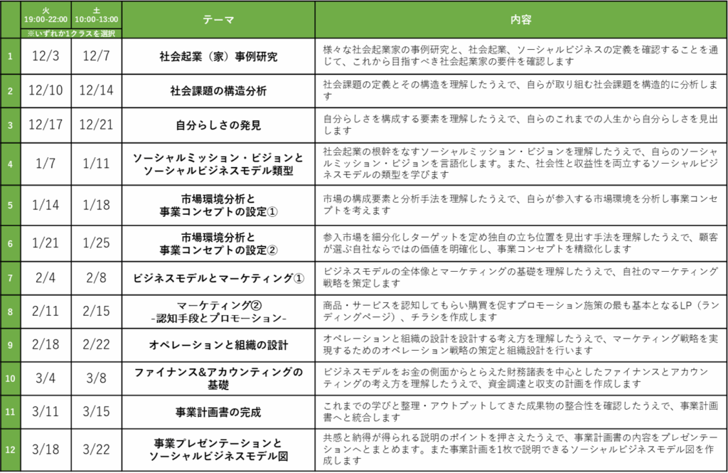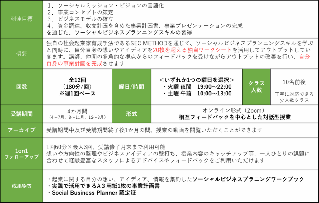 今回特別プログラムということで、本講座ではなくとも過去に社会起業大学の本科講座をご受講いただいた方でしたら特別価格でご受講いただくことができます。大変お得なプログラムとなっておりますのでぜひこの機会にご活用ください。