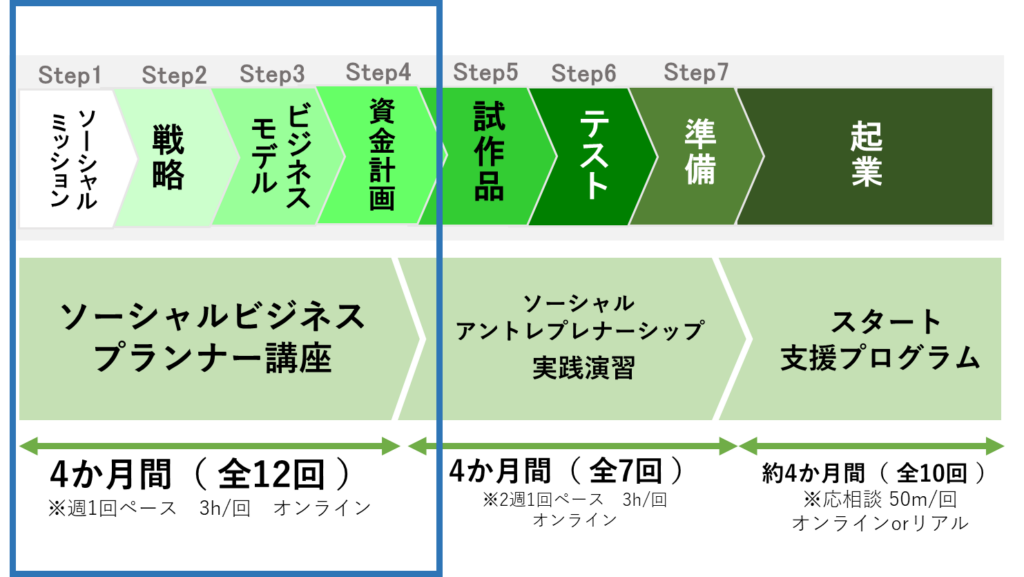 本講座は、社会起業大学が独自に体系化したゼロから起業までの全7stepのうち、Step1~Step4の事業計画書の完成までをアウトプットと相互フィードバックを繰り返しながらで実践することができる講座になっています。