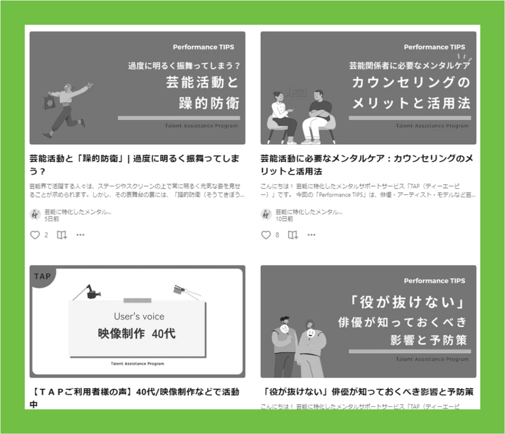 今後は、これまでのオンラインカウンセリングはもちろん、もっとご本人の所属する組織と連携をとった支援なども行っていきます。 例えば活動休止から復帰するときなど、事務所やマネージャーさん、周囲の方との協力体制がしっかりと機能することでよりよい活動復帰にしていけるので、近い未来はそういったこともメニューにしていく予定です。