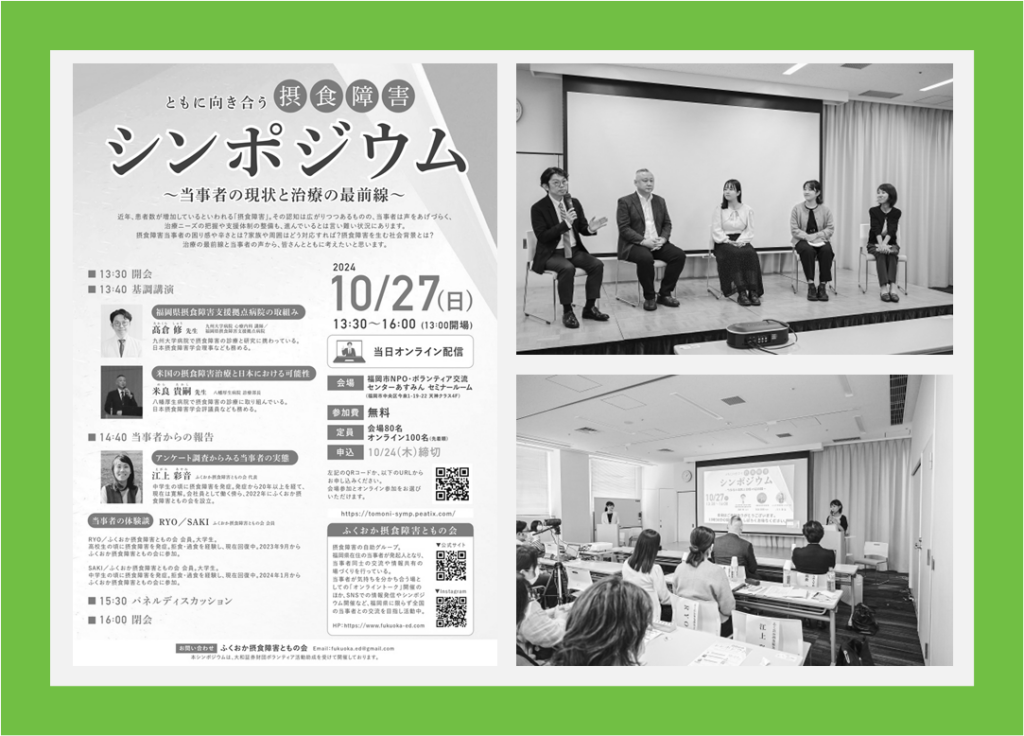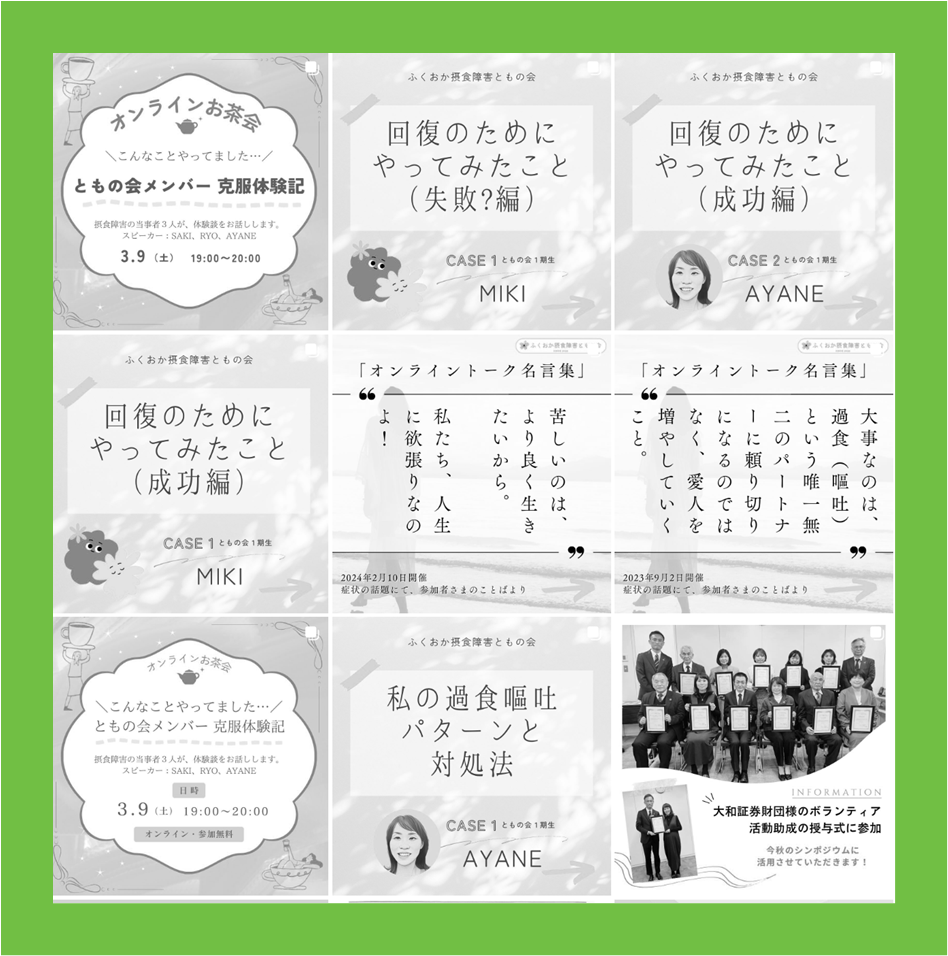 具体的には、当事者が気持ちを分かち合う場としてのオンライントークの運営や、SNSやメディアを通した体験談の情報発信、摂食障害をめぐる課題を社会に発信するためのシンポジウムの開催などを行っています。