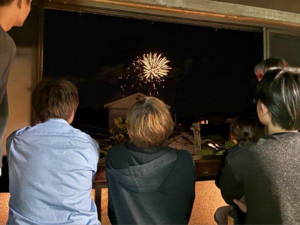おっともう一つ忘れていた。沖津氏が熱弁を振るっている最中に、いきなり地域開催のサプライズ花火が始まった。海岸あたりで打ち上げ花火が始まり、約30分近く続いた。何たる僥倖!それはそれは見事な花火で参加者一同シビレてしまった。2階の廊下から楽しませて頂いた。ついてましたね、塾4期の皆さん!