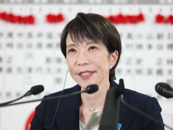 バラを背景に笑みを浮かべる高市さん(引用:日本経済新聞)