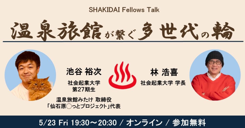【アーカイブ動画】温泉旅館が繋ぐ多世代の輪 5/23(金)19:30~20:30 SHAKIDAI Fellows Talk | 【公式】社会起業家を育成するソーシャルビジネススクール 社会起業大学