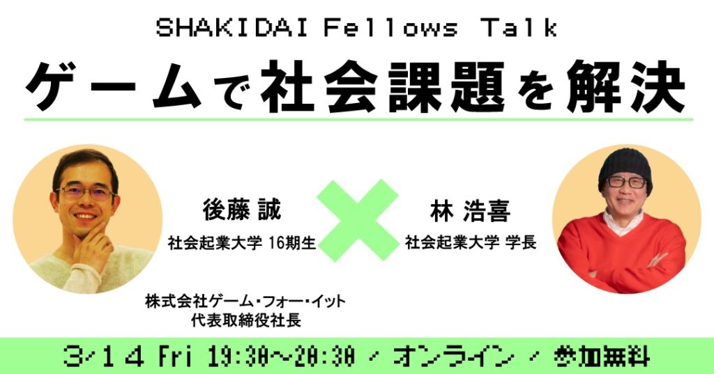 SHAKIDAI Fellows Talkは、社会起業大学の卒業生と学長の林浩喜によるトークセッションです。
